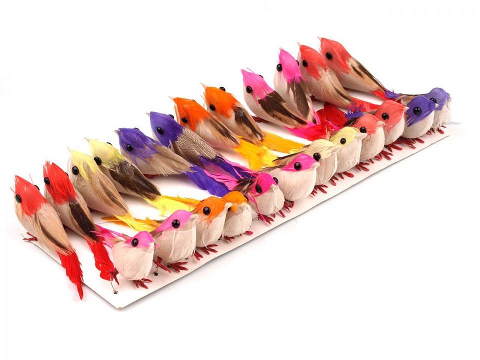 Dekorační ptáček je vyrobený z plastu a jeho tělo pokrývá barevné peří. Na nohách má připevněné dva kovové drátky, díky kterým můžete ptáčka připevnit například na věnec, větvičku, záclonu či ho naaranžovat do květinových vazeb.