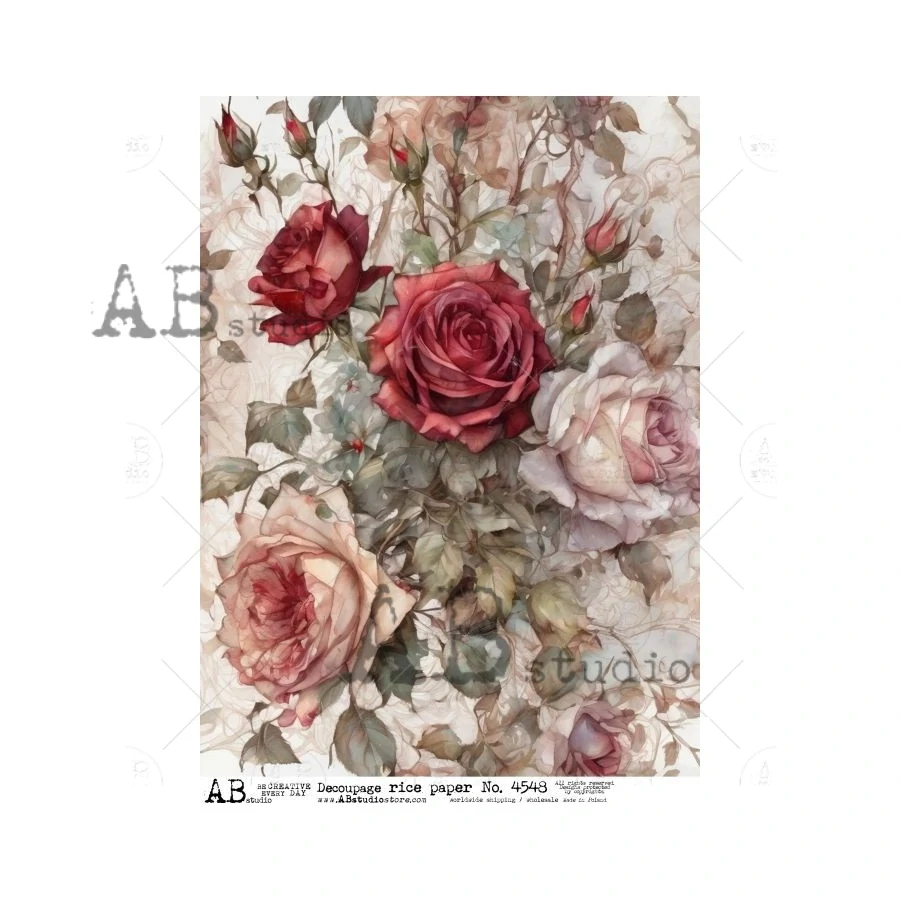 Rýžový papír na decoupage od ABstudia.Velikost: A4 (210 mm x 297 mm) / (8,27" x 11,69")34-35 g/m2 / vysoce kvalitní tisk.Designová plocha: 200 mm x 280 mm.Vodoznak ABstudio je viditelný pouze online. Výtisky nemají vodoznak.Rýžový papír je pro začátečníky nejlepší ze všech druhů materiálů, protože j... celý popis