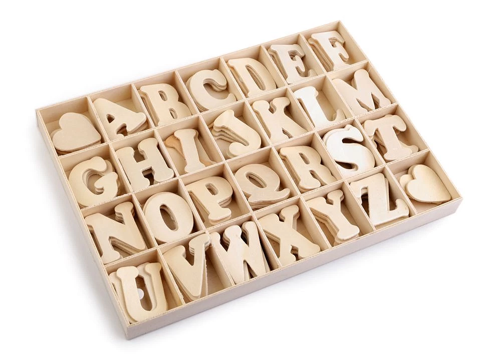 Dřevěná písmena v krabici zobrazují celou abecedu. Můžete s nimi ozdobit dveře dětského pokoje, skříně apod. Z rubu mají lepicí pásku. Abeceda i krabice je vyrobená z překližky.